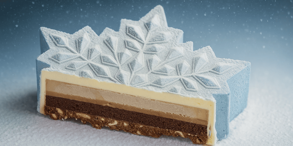 A multi-layered masterpiece of vanilla rum mousse, salted caramel, rum chestnut crémeux, chocolate almond sponge, and hazelnut feuilletine crunch. This 6″ gateau serves 6–8 guests and comes with a regular candle and cake knife — perfect for festive celebrations or intimate gatherings.