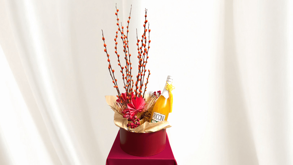 Add a beautiful decoration to your home with this festive Chinese New Year collaboration betwen Lap Spirits and Bloomen. The arrangement, featuring lush pussy willow branches symbolising growth prosperity and good fortune, is thoughtfully styled to bring abundance and positive energy into any space. It comes paired with a bottle of Prosecco based Cocktail by Canella.